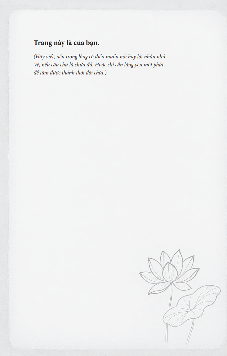 Đừng quên, ở mỗi chặng của hành trình cảm xúc, sẽ có những trang trống dành riêng cho bạn. Hãy tận dụng để ghi lại suy ngẫm, đúc kết hoặc đơn giản là lắng nghe chính mình sau những điều vừa đọc. Đừng bỏ lỡ cơ hội để quyển sách thật sự chạm đến bạn và mang lại giá trị tốt nhất.